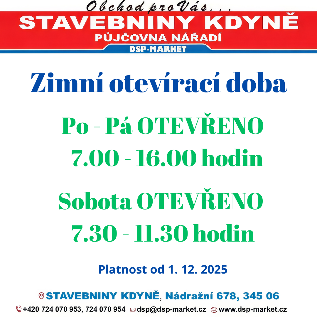 icon_widget_image Po - pá 8:00 – 17.00 | So 8.00 – 11.30 | Ne zavřeno icon_widget_image Mrákov č.21, 345 01 - přímo v administrativní budově areálu ZOD icon_widget_image +420 724 634 875 +420 602 194 247 +420 379 722 966 icon_widget_image obchod@dsp-market.cz